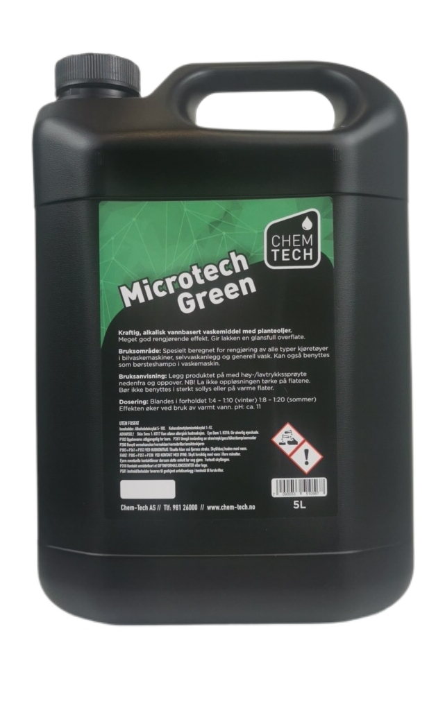 Chem-Tech Microtech Green ble testet hos oss i 2022, og slo umiddelbart an. Det er et kraftig vannbasert rengjøringsprodukt med planteoljer. Det er alkalisk, mildt miljømessig og svært effektivt, så det egner seg blant annet som en forvask til kjøretøy, men bør unngås på Tesla Model 3 og Y med matte lister.