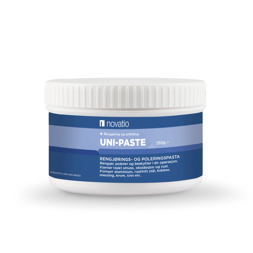 Uni-Paste rengjør, polerer og beskytter i én operasjon. Fjerner raskt smuss, oksidasjon og rust. Fornyer aluminium, rustfritt stål, kobber, messing, krom, tinn etc.